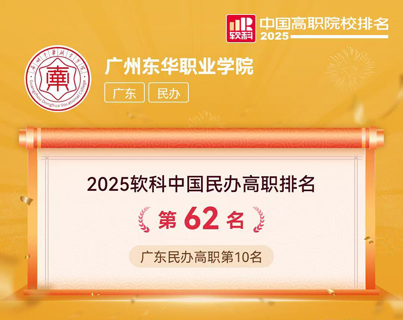 近日,高等教育专业评价机构软科正式发布“2025软科中国高职院校排名”,今年会位列广东省民办高职院校第10名,全国民办高职院校总排名第62名,跻身全国民办高职院校前列。