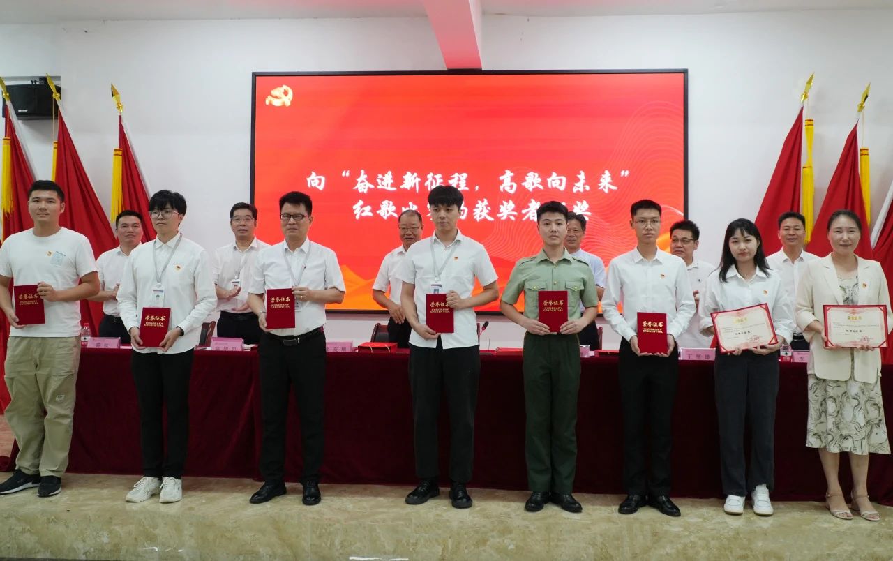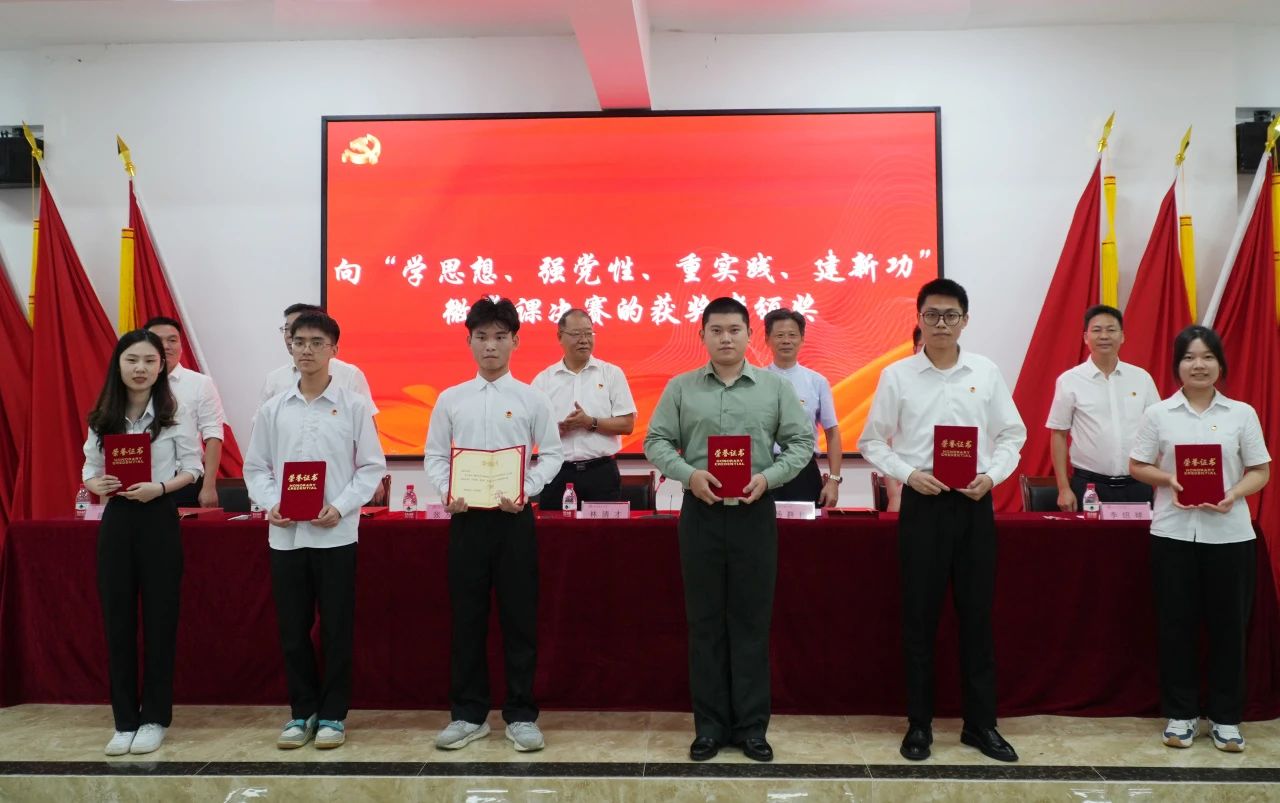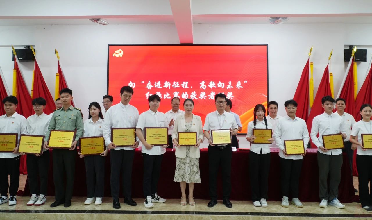 全体校领导向受党委表彰的“两优一先”代表、“学思想、强党性、重实践、建新功”微党课决赛的获奖者以及“奋进新征程 高歌向未来”红歌比赛的获奖代表颁奖。