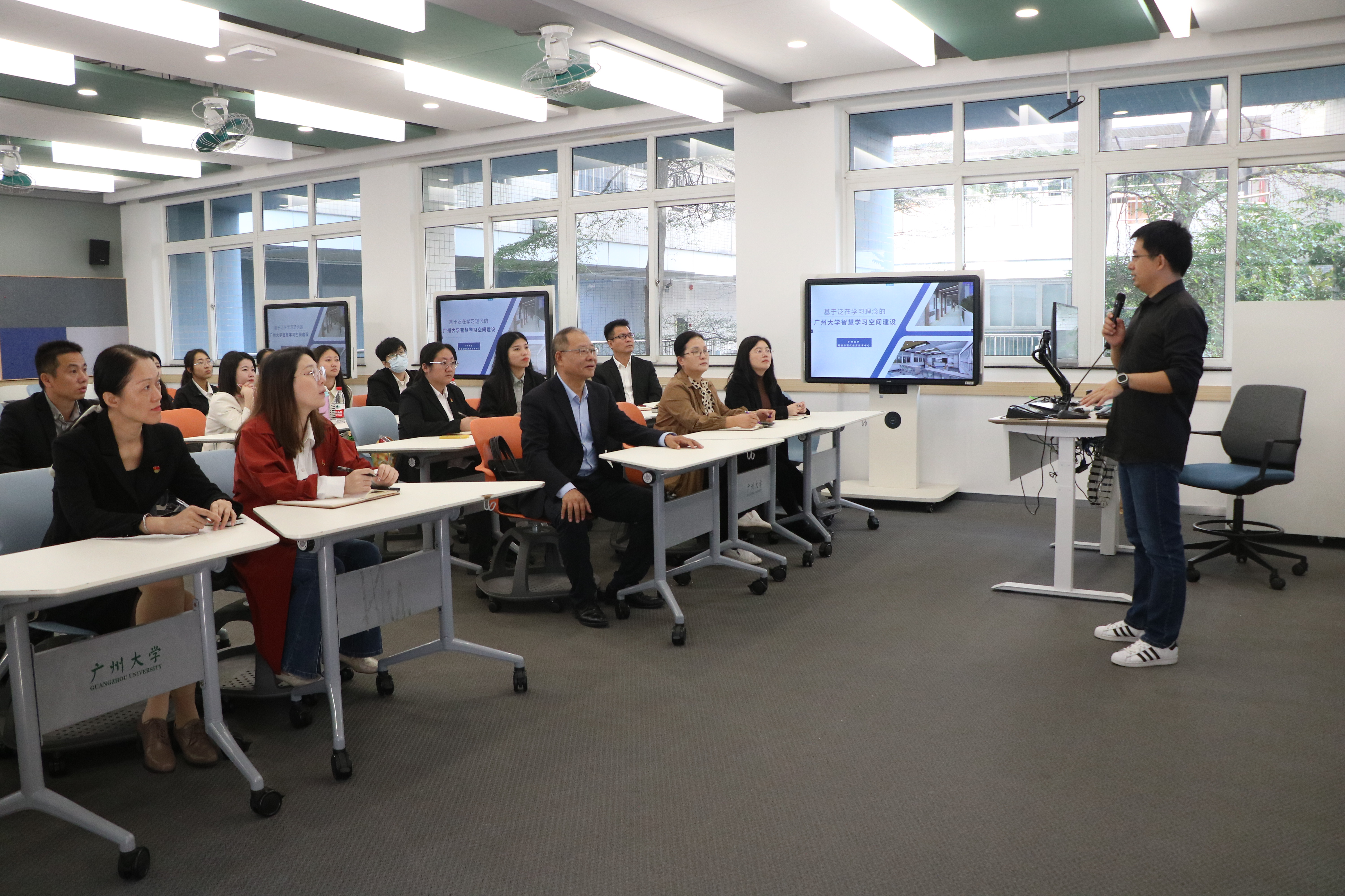 穿过广州大学党建文化长廊,今年会官网一行来到智慧教室。网络中心老师谢亮作了题为《基于泛在学习理念的广州大学智慧学习空间建设》的报告,并从学习空间再设计的原因、线下空间:SMART模型、线上空间:应用管理平台、应用效果、未来建设与思考五大方面内容讲解了智慧学习课堂的实际应用与实践意义。