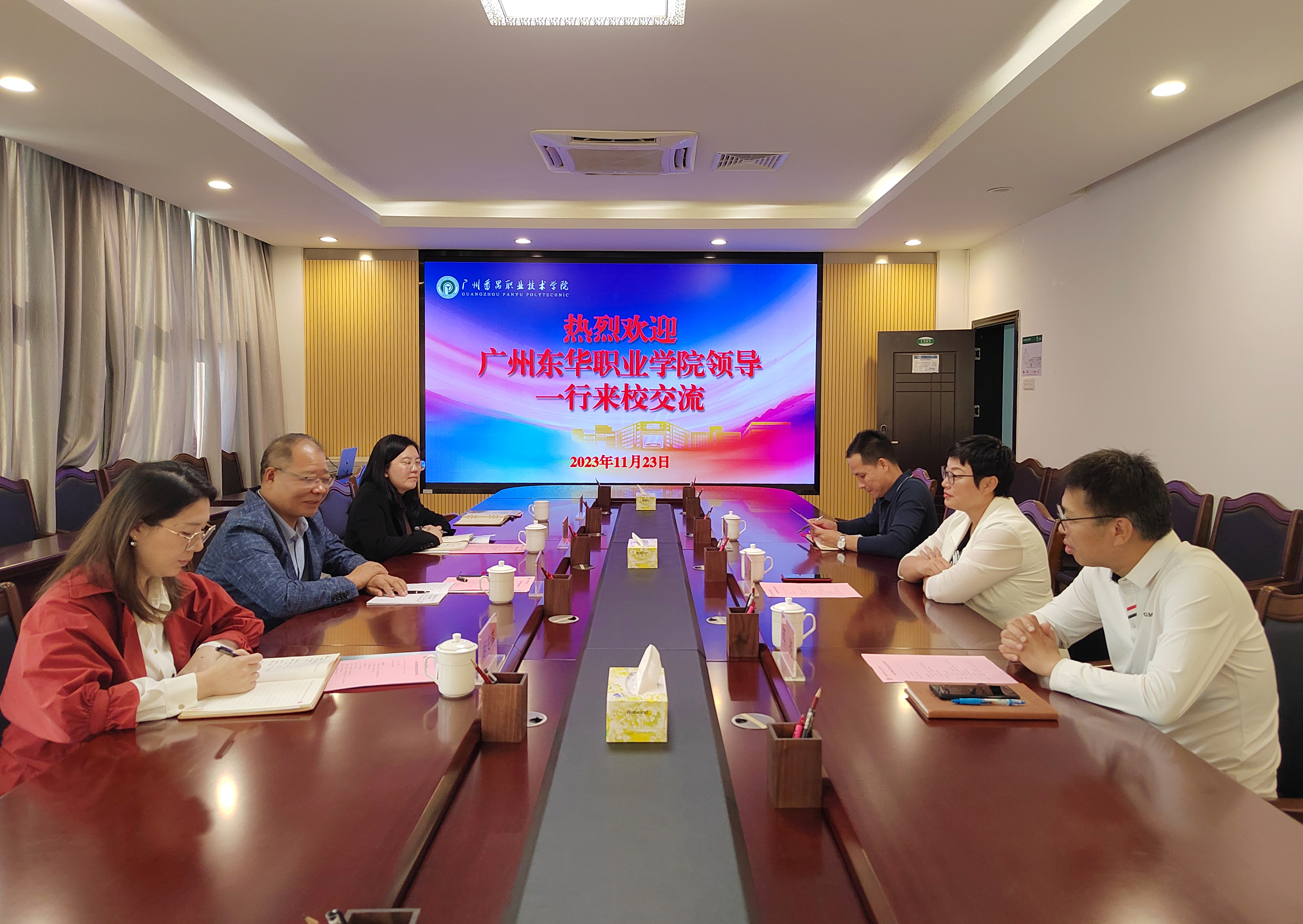 参观学习结束后,林清才书记带领相关党委职能部门负责人到广州番禺职业技术学院就党建工作进行交流学习。广州番禺职业技术学院党委副书记姚瑶、党委组织部部长郑亮、党委宣传部部长曾海宾热情接待。双方就党建品牌、标杆院系、样板支部建设,“双带头人”全覆盖工作,以及党委换届工作等方面作了深入交流与探讨。
