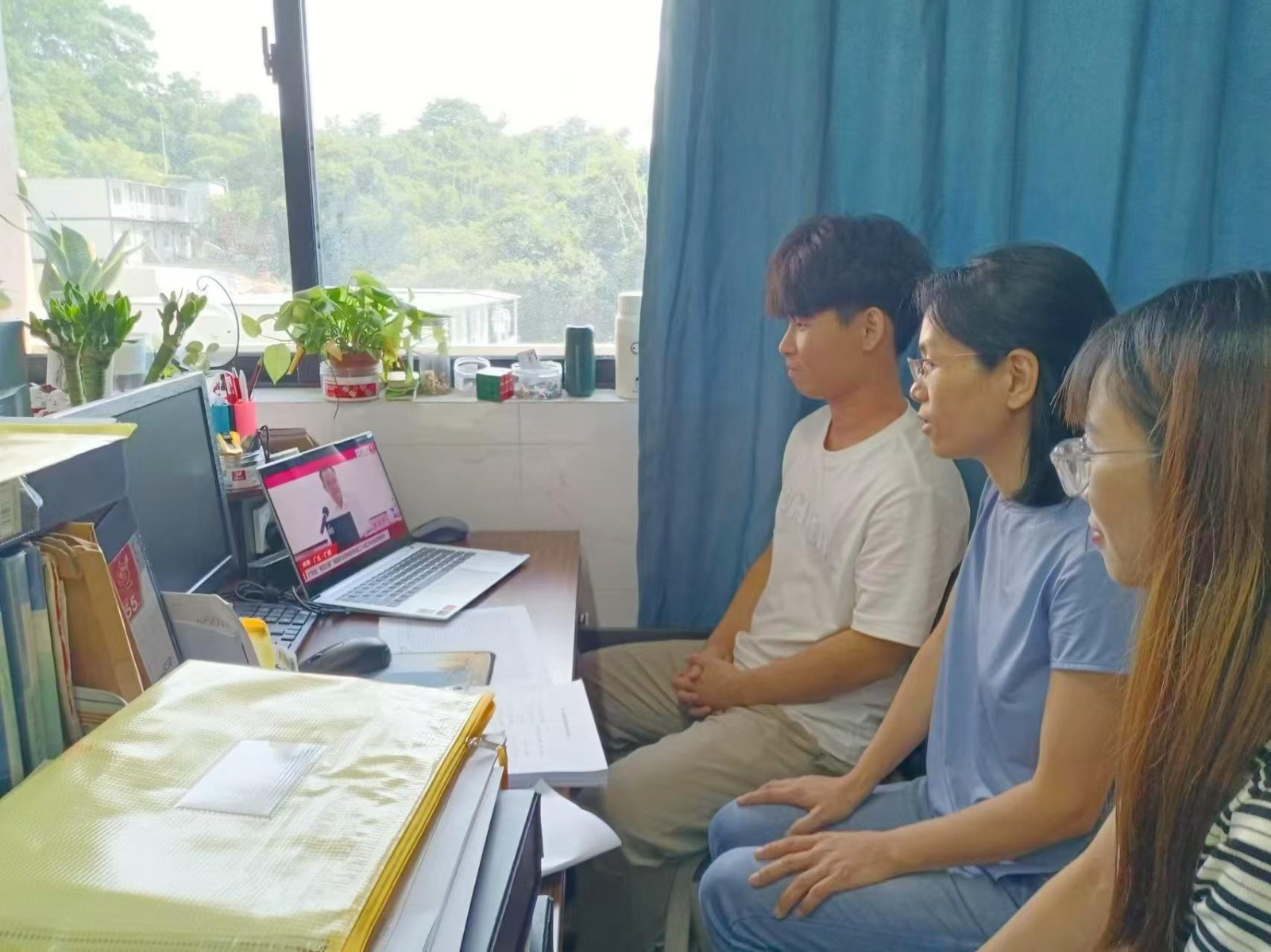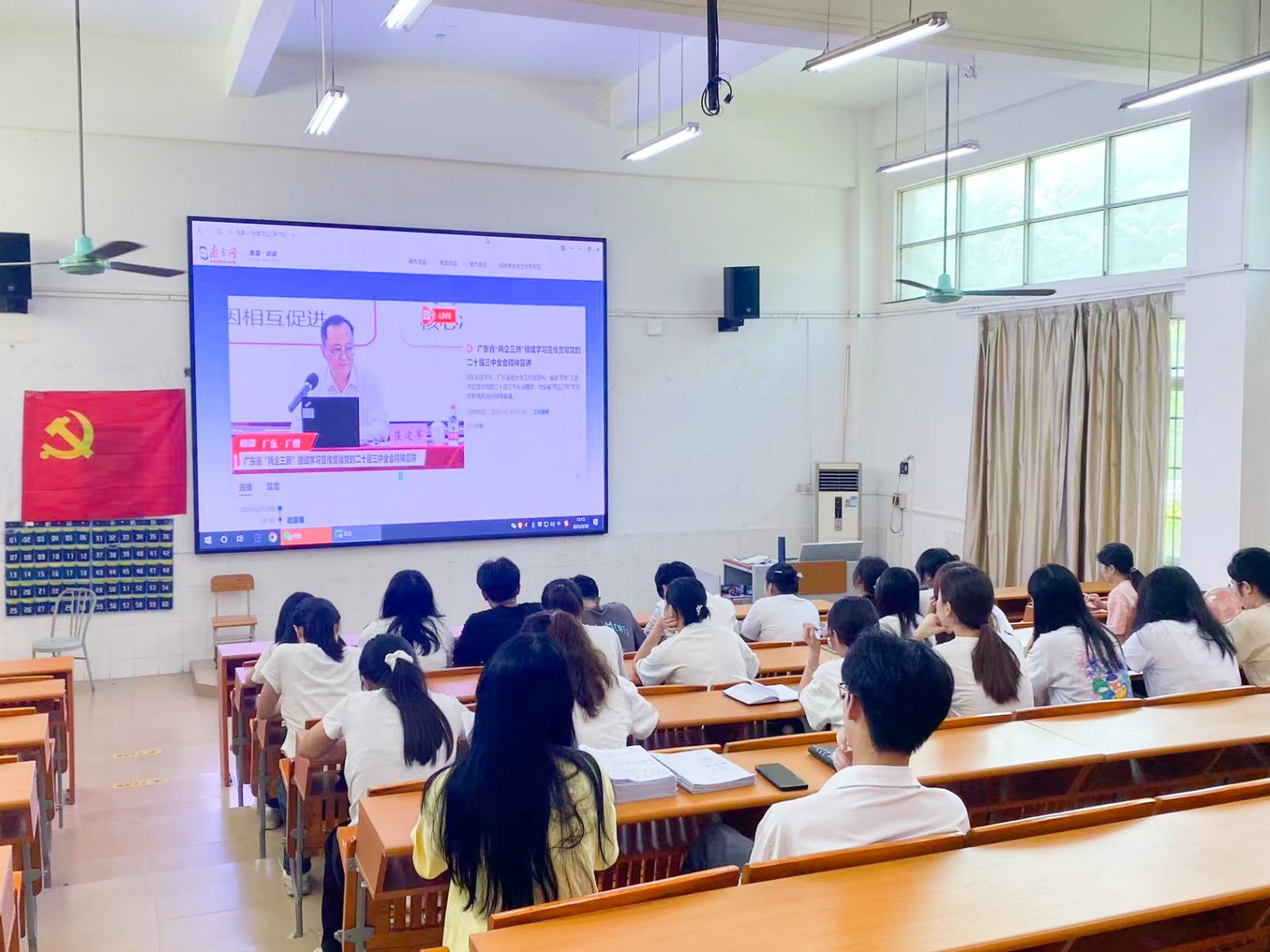 学校党委书记林清才、党委副书记陈钦、副校长王坚雄、温志宏、党委职能部门负责人、党(总)支部书记在综合楼602会议室集中观看。