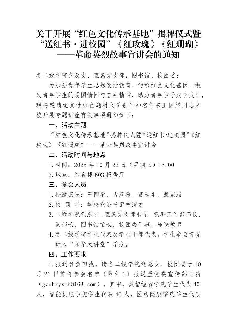 关于开展“红色文化传承基地”揭牌仪式暨“送红书·进校园”《红玫瑰》《红珊瑚》——革命英烈故事宣讲会的通知