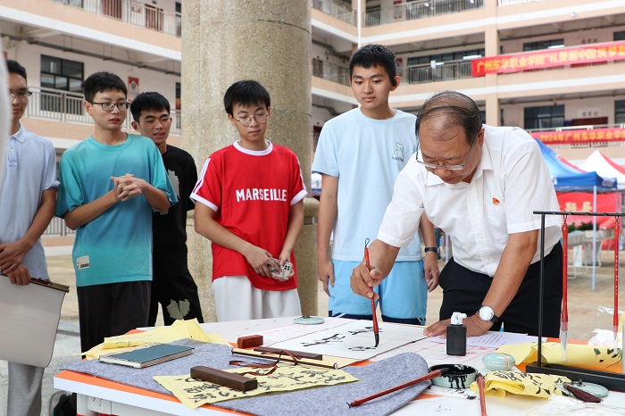 在庆祝新中国成立75周年的热烈氛围中,党委宣传部精心筹备的书画展有序开展。活动现场,党委林清才书记挥毫泼墨,以笔传情,用书法这一传统艺术形式表达对祖国的深情祝福。周围,学生们专注观摩,在墨香中感受传统文化的魅力与爱国情怀的传承,这一幕成为校园内一道充满文化韵味与爱国气息的亮丽风景。
