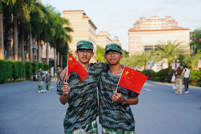 两位身着迷彩军训服的少年并肩而立,脸上洋溢着自信的微笑。他们各自手持一面鲜艳的五星红旗,红旗上的五颗金星在阳光下熠熠生辉。这简单而真挚的一幕,传递出新时代青年对祖国的热爱与自豪,以及他们在军训中磨砺出的团结与坚韧。