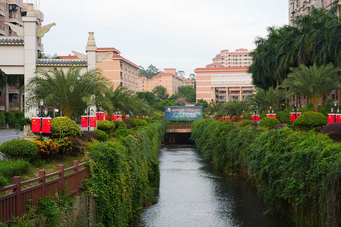 ▲一条清幽的小河蜿蜒穿过校园,两岸绿植如茵,郁郁葱葱。河岸边,一面面五星红旗整齐排列,在翠绿的映衬下鲜艳夺目。远处,图书馆和教学楼静静伫立,庄重而典雅。这幅画面,自然之美与爱国之情交织,展现出校园独有的宁静与蓬勃朝气。