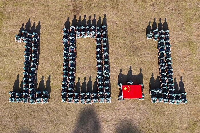 ▲从高空俯瞰,一片开阔的草地上,军训学生们以身体为笔,以纪律为墨,精心排列成“10.1”的壮丽造型。在“10.1”右下方,一面鲜艳的五星红旗傲然铺展,那夺目的红与迷彩绿相互映衬,成为视觉的焦点。