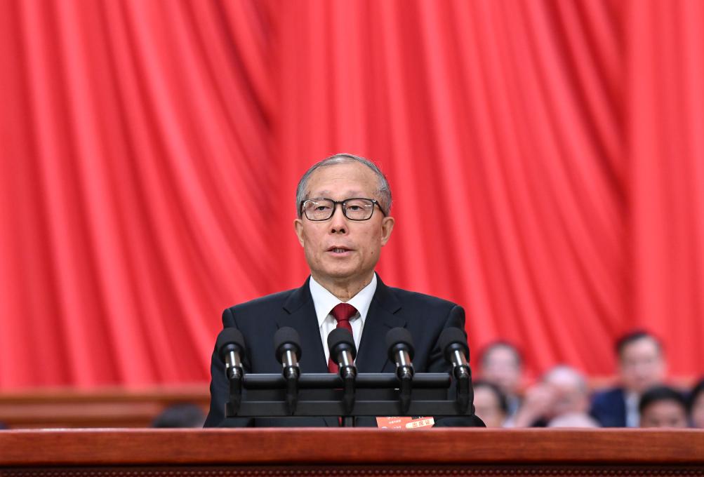 3月5日上午,第十四届全国人民代表大会第三次会议在北京人民大会堂开幕。受全国人大常委会委托,全国人大常委会副委员长李鸿忠作关于全国人民代表大会和地方各级人民代表大会代表法修正草案的说明。新华社记者 张领 摄
