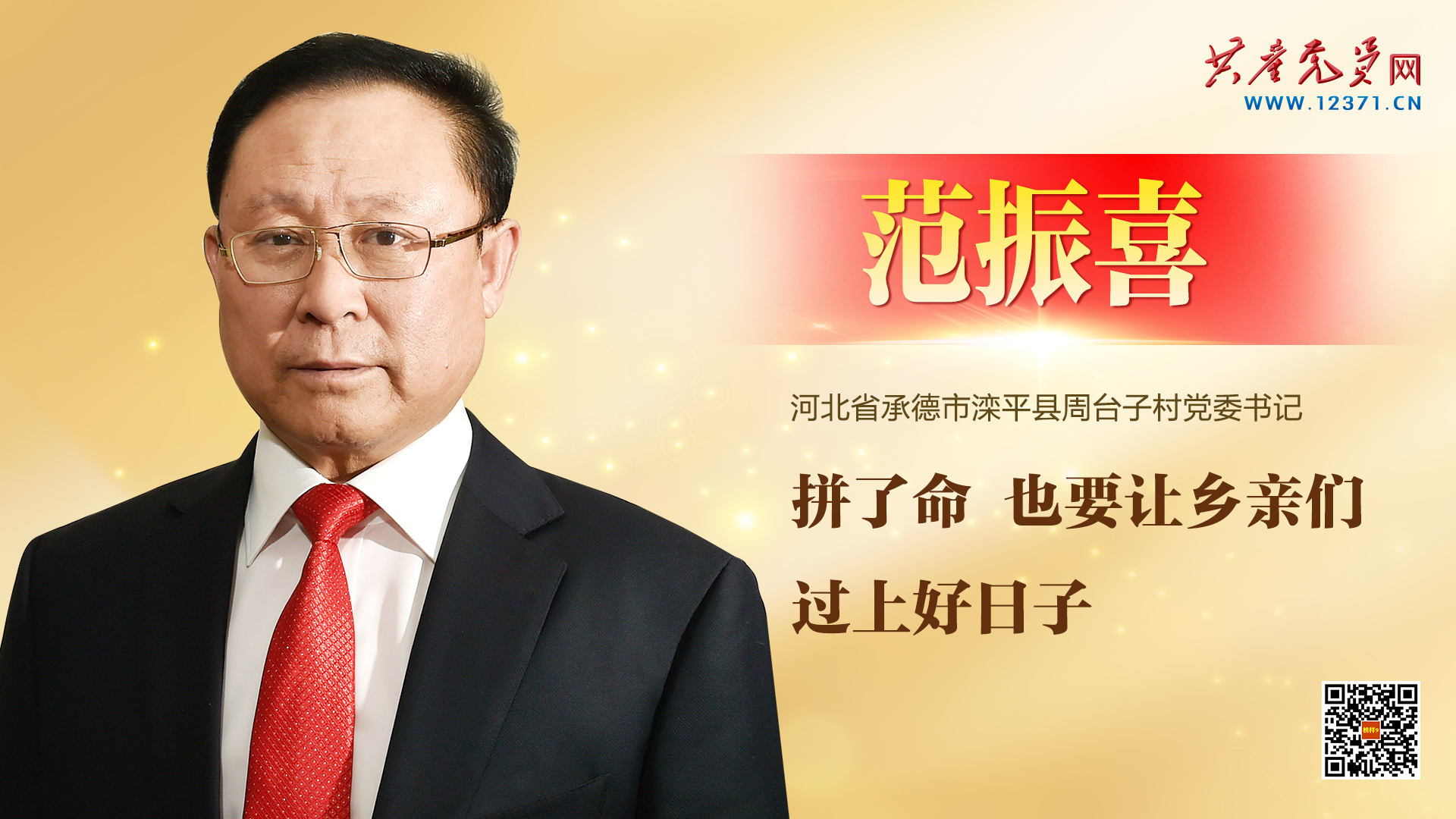范振喜,满族,1962年6月生,中共党员,河北省承德市滦平县周台子村党委书记、村委会主任,党的十六大、十七大、十八大、十九大代表,第十四届全国人大代表。荣获全国优秀共产党员、全国劳动模范、全国最美退役军人、新中国成立60年“三农”模范人物等。