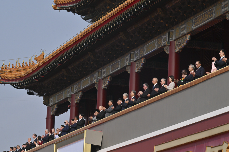 9月3日,纪念中国人民抗日战争暨世界反法西斯战争胜利80周年大会在北京天安门广场隆重举行。这是大会开始前,中共中央总书记、国家主席、中央军委主席习近平同出席大会的外方代表团团长前往天安门城楼。新华社记者 申宏 摄