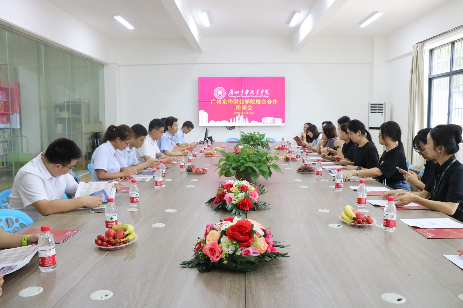 广州市人力资源市场服务中心(广州市高校毕业生就业指导中心)副主任何全穗、广州市荔湾区人社局副局长周华、荔湾区就业中心副主任陈孝祖、广州市白云区太和镇人民政府四级调研员李湛峰、广东保伦电子股份有限公司代表王欣倩经理,学校全体校领导参加见面会开幕式。开幕式由副校长王坚雄主持。