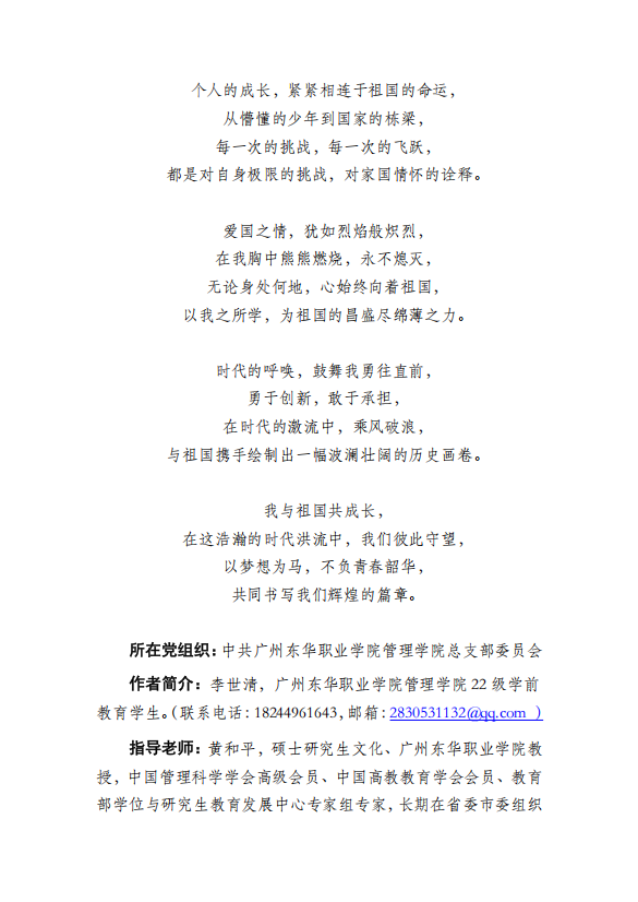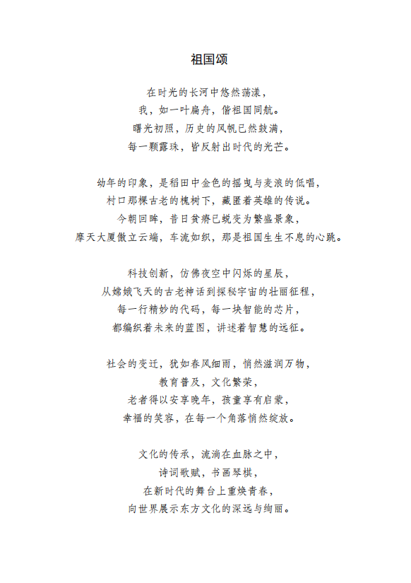 作品简介:文章以深情而富有诗意的笔触,描绘了祖国从贫瘠到繁荣的壮丽变迁,以及个人与祖国共成长的深切情感。通过回望历史、讴歌科技创新、社会变迁与文化传承,作者展现了新时代中国的蓬勃生机与辉煌成就。
