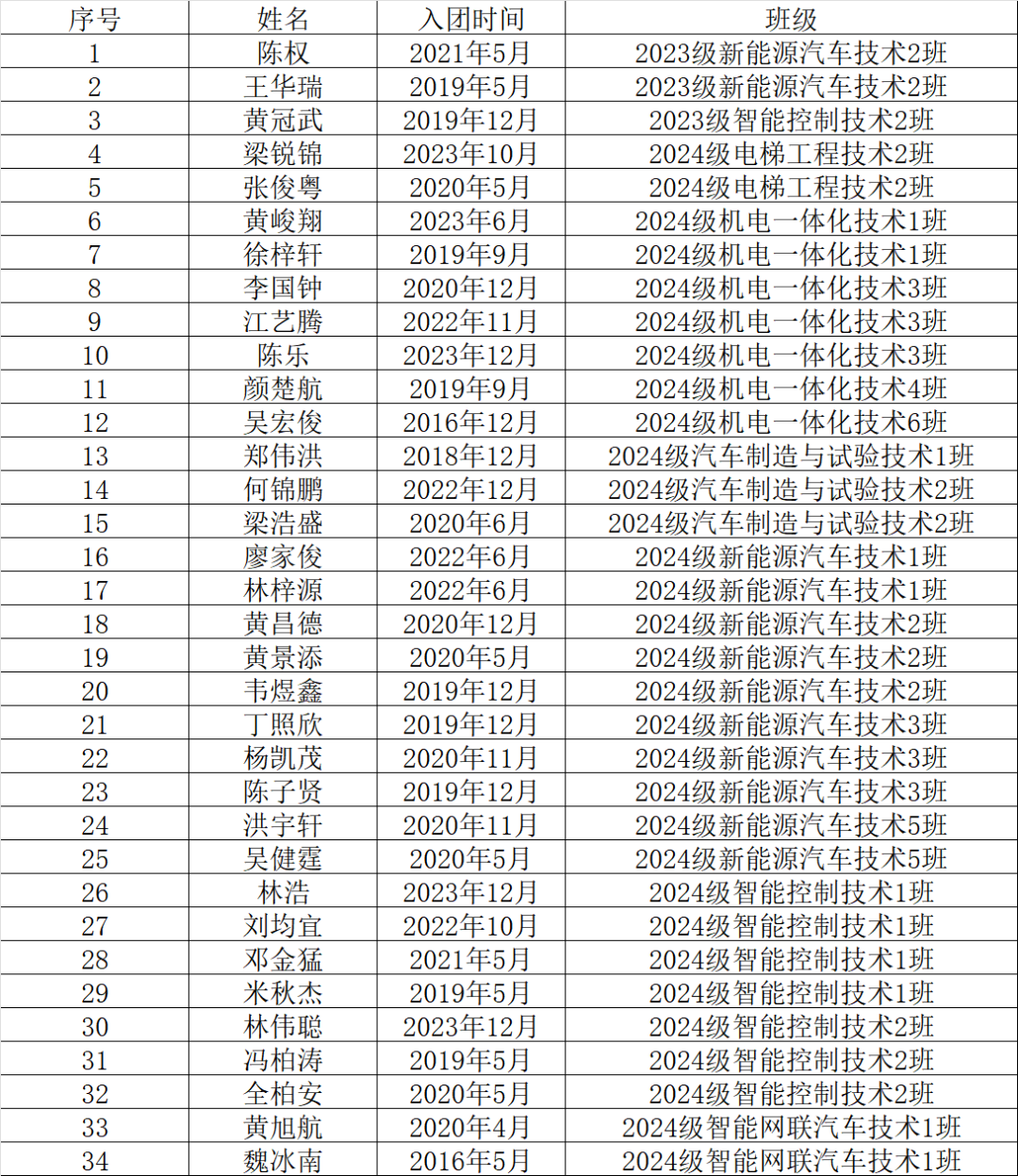 关于智能机电学院2024—2025学年第二学期拟推荐林序鑫等34位入团积极分子的公示